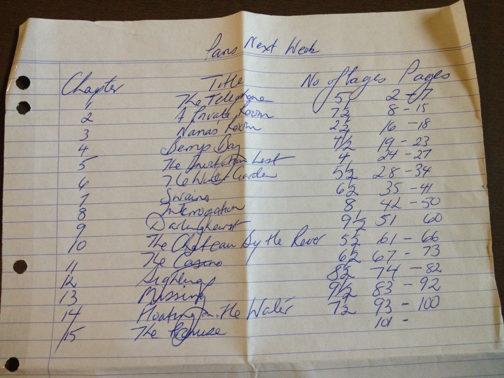 chaptersHello, I’m back! The mistress of old school. The beauty of this piece of paper is that all the chapters (or most of them) are visible at a glance. Writing programs will obviously show much more but that can be distracting. Along with my notebook and my record of pages written (see previous post) this is actually all the paper I deal with in writing. The rest is on my laptop. Oh and one draft I print out and edit on paper.