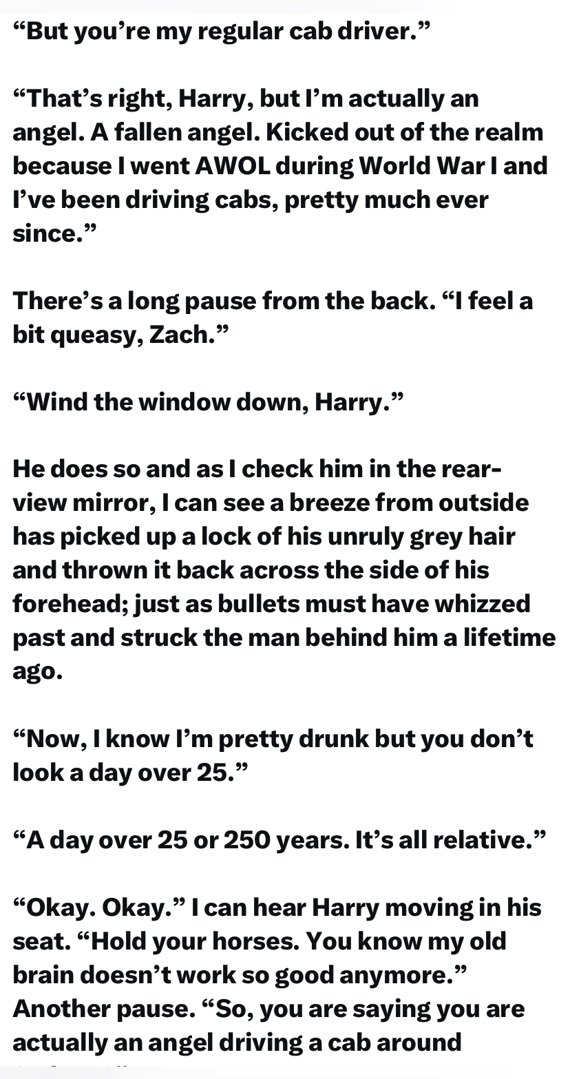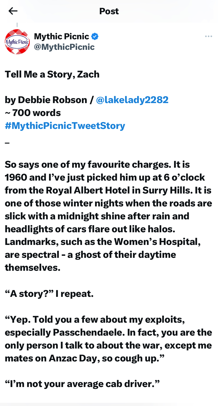 Here is my flash Tell Me a Story, Zach as it appeared on Twitter courtesy of Mythic Picnic. Click each image to read.